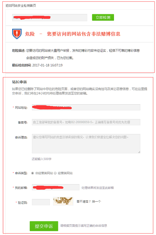 单击图2中所示的链接文字“为什么危险?”页面会跳转到腾讯电脑管家检测以及申诉页面(图3),这个页面上会列出被列为危险网站的原因,如果您已经删除了危险的页面,或者您的网站确实没有挂马及其它恶意信息可以在此页面上提交申诉。