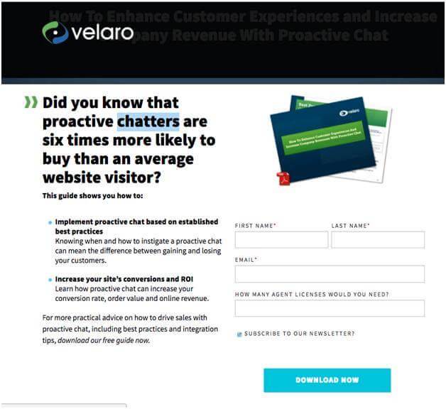 想解决这个问题非常简单:着陆页只创建并且着重于一个商品或解决方案。Velaro Live Chat的着陆页做的就很好。他们创建了一个指南,主要讲解了为什么实时聊天很重要以及如何进行实时聊天。