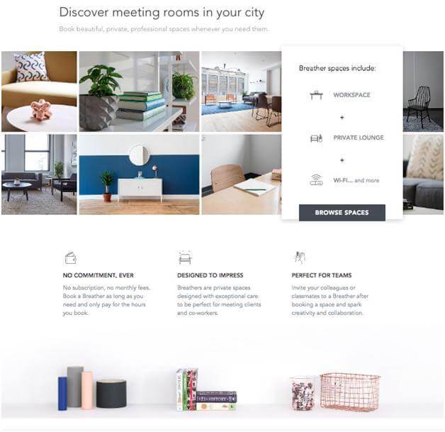 Breather是一家替公司寻找会议室的中介机构,他的一个着陆页可以播放高清图像,再加上可爱的图标来突出他们的卖点。