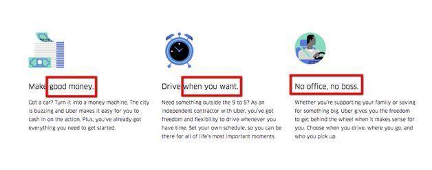 优步美国官网的着陆页吸引那些希望拥有财务独立性的人,"金钱"、"想要的工作"、"没有办公室,没有老板"这些和用户产生共鸣的价值导向非常吸引美国人民。为产品或服务构建正确的价值主张,你需要了解目标受众的痛点并告诉他们,你可以帮助他们。